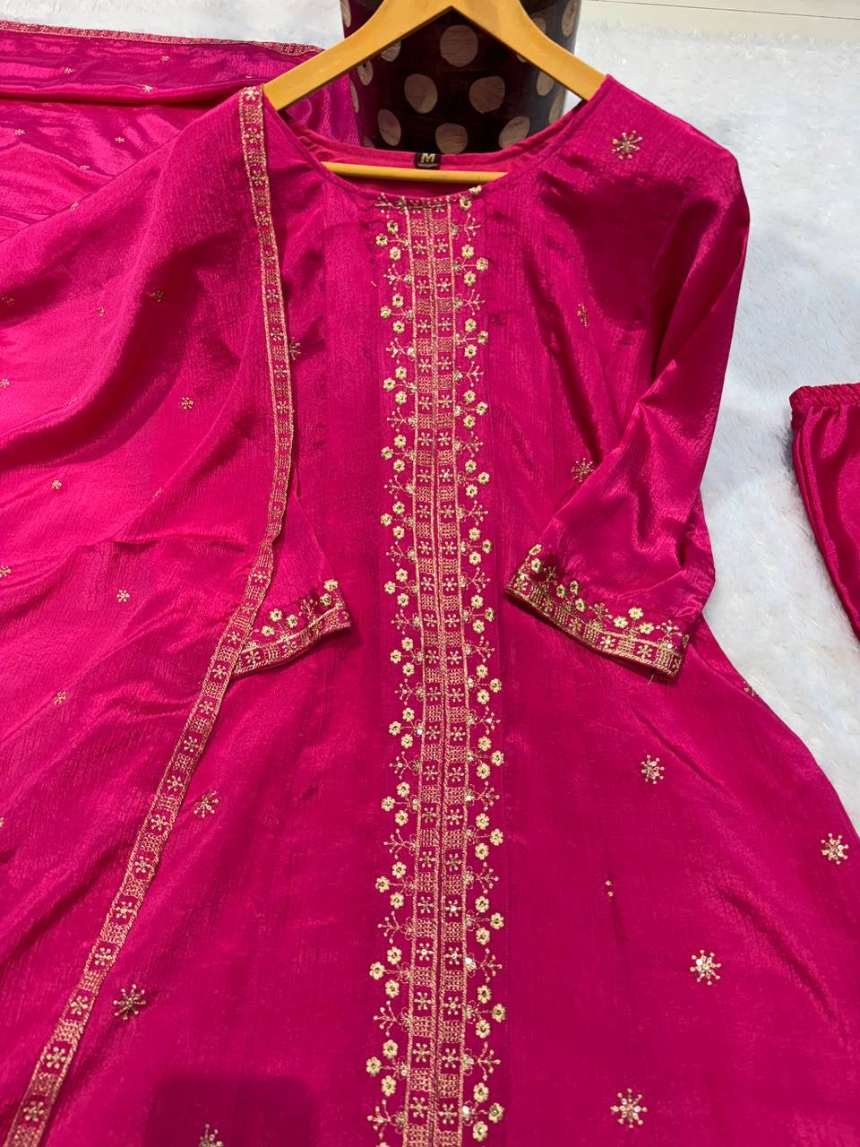 • 3-pair Anakrkali Suit Set you've described seems to be a party wear outfit made from have pure chinon fabric with sequence embroidery work .(3-Pair)